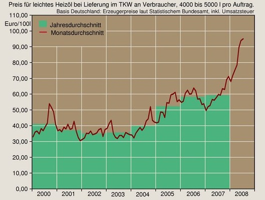 Der Heizölpreis ist in der 26. KW um 0,7% gegenüber der Vorwoche gestiegen. 3000 l der Sorte “Standardqualität“ kosteten 95,10 Euro/100 l.