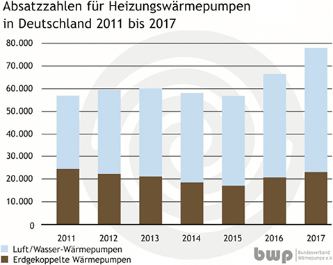 Nachdem bereits 2016 ein Absatzrekord verzeichnet wurde, wuchs der deutsche Wärmepumpen-Markt auch 2017 um 17 % deutlich. Insgesamt wurden laut Bundesverband Wärmepumpe (BWP) rund 78.000 Heizungswärmepumpen verkauft.