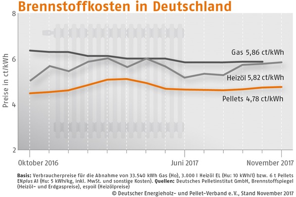 Der Bezugspreis für Holzpellets in Deutschland ist im November 2017 gegenüber dem Vormonat um 1,0 % gestiegen. Wie der Deutsche Energieholz- und Pellet-Verband (DEPV) berichtet, betrug der Durchschnittspreis im November 239,02 (Vormonat 236,64) Euro/t.
