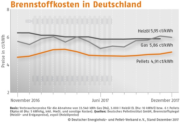 Der Bezugspreis für Holzpellets in Deutschland ist im Dezember 2017 gegenüber dem Vormonat um 2,7 % gestiegen. Wie der Deutsche Energieholz- und Pellet-Verband (DEPV) berichtet, betrug der Durchschnittspreis im Dezember 245,52 (Vormonat 239,02) Euro/t.