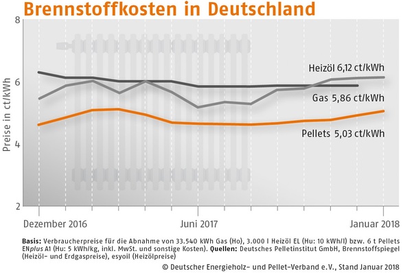 Der Bezugspreis für Holzpellets in Deutschland ist im Januar 2018 gegenüber dem Vormonat um 2,4 % gestiegen. Wie der Deutsche Energieholz- und Pellet-Verband (DEPV) berichtet, betrug der Durchschnittspreis im Januar 251,34 (Vormonat 245,52) Euro/t.