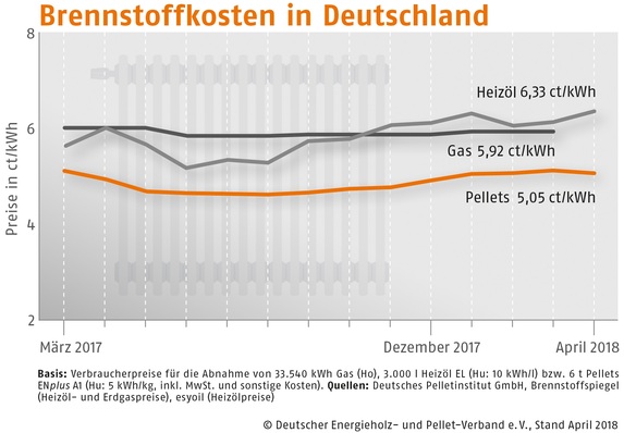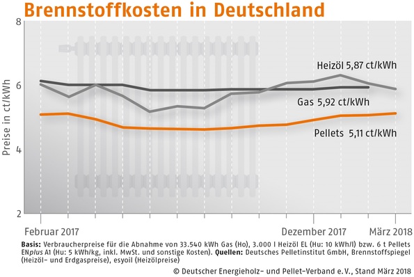 Der Bezugspreis für Holzpellets in Deutschland ist im März 2018 gegenüber dem Vormonat um 0,9 % gestiegen. Wie der Deutsche Energieholz- und Pellet-Verband (DEPV) berichtet, betrug der Durchschnittspreis im März 255,28 (Vormonat 253,03) Euro/t.