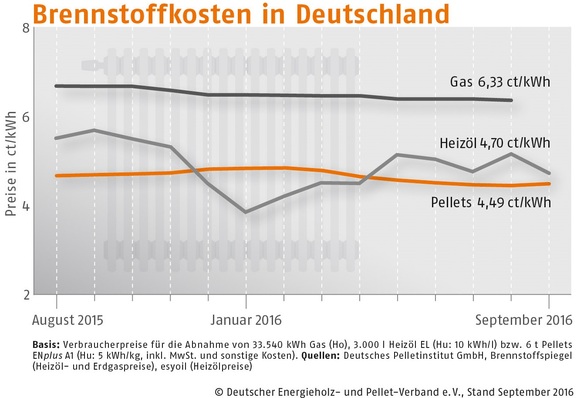 Der Bezugspreis für Holzpellets in Deutschland ist im September 2016 gegenüber dem Vormonat um 0,8 % gestiegen. Wie der Deutsche Energieholz- und Pellet-Verband (DEPV) berichtet, betrug der Durchschnittspreis im September 224,43 (Vormonat 222,54) Euro/t.