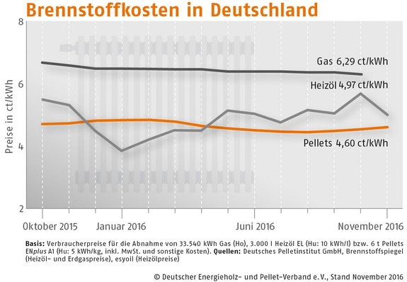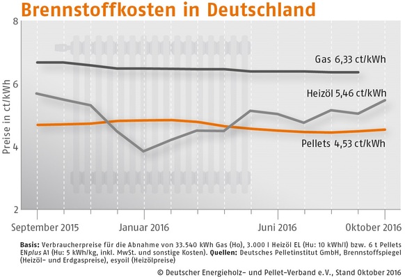 Der Bezugspreis für Holzpellets in Deutschland ist im Oktober 2016 gegenüber dem Vormonat um 0,9 % gestiegen. Wie der Deutsche Energieholz- und Pellet-Verband (DEPV) berichtet, betrug der Durchschnittspreis im Oktober 226,37 (Vormonat 224,43) Euro/t.