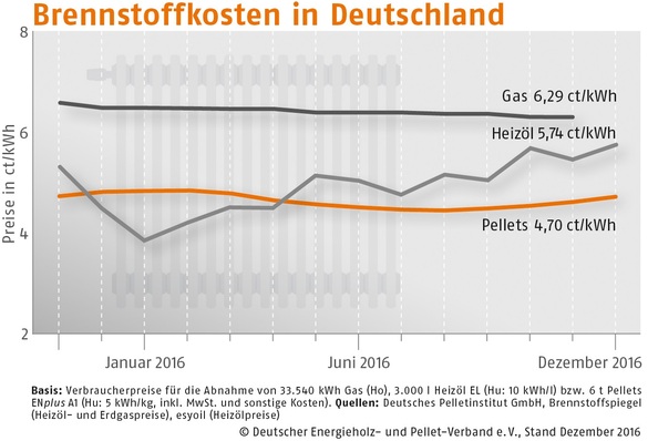 Der Bezugspreis für Holzpellets in Deutschland ist im Dezember 2016 gegenüber dem Vormonat um 2,2 % gestiegen. Wie der Deutsche Energieholz- und Pellet-Verband (DEPV) berichtet, betrug der Durchschnittspreis im Dezember 235,17 (Vormonat 230,20) Euro/t.