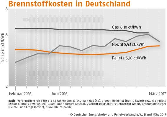 Der Bezugspreis für Holzpellets in Deutschland ist im März 2017 gegenüber dem Vormonat um 0,7 % gestiegen. Wie der Deutsche Energieholz- und Pellet-Verband (DEPV) berichtet, betrug der Durchschnittspreis im März 255,18 (Vormonat 253,39) Euro/t.