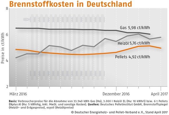 Der Bezugspreis für Holzpellets in Deutschland ist im April 2017 gegenüber dem Vormonat um 3,6 % gesunken. Wie der Deutsche Energieholz- und Pellet-Verband (DEPV) berichtet, betrug der Durchschnittspreis im April 246,08 (Vormonat 255,18) Euro/t.
