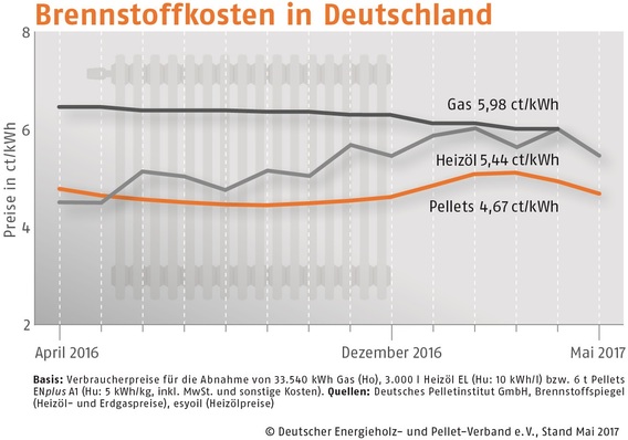 Der Bezugspreis für Holzpellets in Deutschland ist im Mai 2017 gegenüber dem Vormonat um 5,0 % gesunken. Wie der Deutsche Energieholz- und Pellet-Verband (DEPV) berichtet, betrug der Durchschnittspreis im Mai 233,73 (Vormonat 246,08) Euro/t.