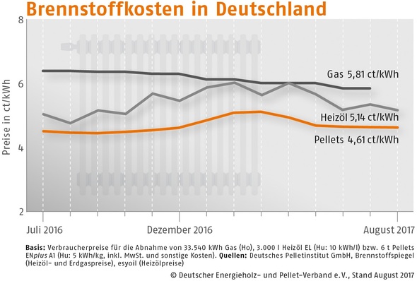 Der Bezugspreis für Holzpellets in Deutschland ist im August 2017 gegenüber dem Vormonat um 0,4 % gesunken. Wie der Deutsche Energieholz- und Pellet-Verband (DEPV) berichtet, betrug der Durchschnittspreis im August 230,46 (Vormonat 231,28) Euro/t.