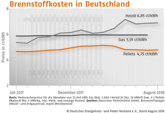 Der Bezugspreis für Holzpellets in Deutschland ist im August 2018 gegenüber dem Vormonat um 0,5 % gestiegen. Wie der Deutsche Energieholz- und Pellet-Verband (DEPV) berichtet, betrug der Durchschnittspreis im August 237,49 (Vormonat 236,36) Euro/t.