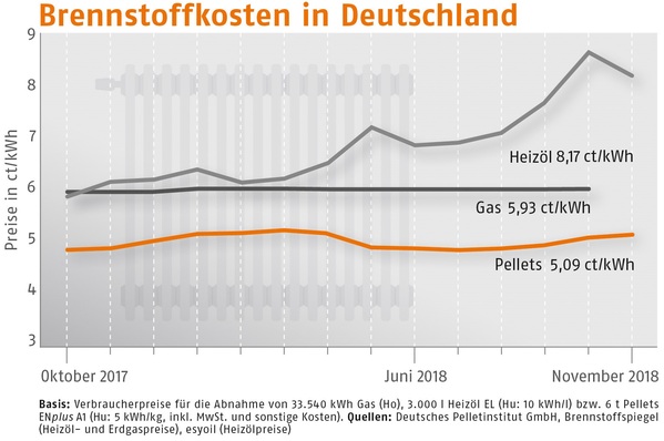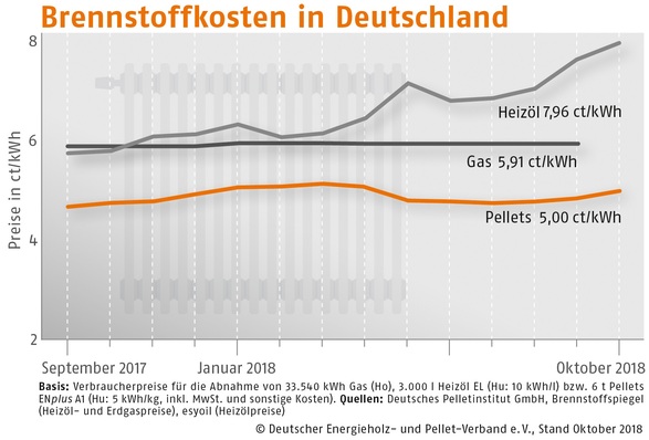 Der Bezugspreis für Holzpellets in Deutschland ist im Oktober 2018 gegenüber dem Vormonat um 3,7 % gestiegen. Wie der Deutsche Energieholz- und Pellet-Verband (DEPV) berichtet, betrug der Durchschnittspreis im Oktober 249,94 (Vormonat 240,92) Euro/t.