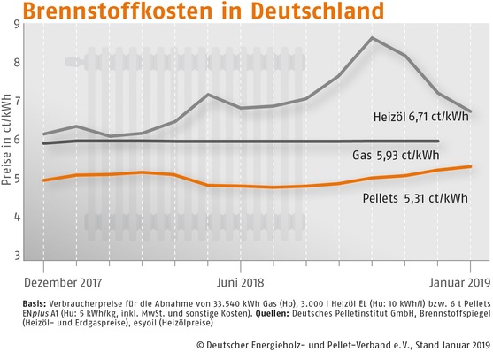 Der Bezugspreis für Holzpellets in Deutschland ist im Januar 2019 gegenüber dem Vormonat um 1,7 % gestiegen. Wie der Deutsche Energieholz- und Pellet-Verband (DEPV) berichtet, betrug der Durchschnittspreis im Januar 265,26 (Vormonat 260,81) Euro/t.