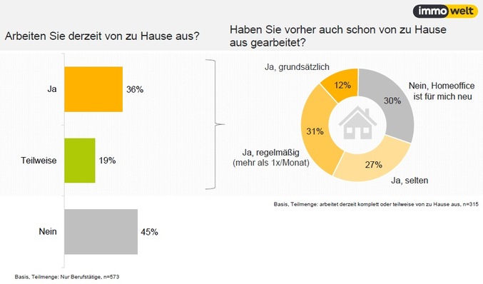 Die Coronavirus-Krise wirkt sich deutlich auf den Arbeitsalltag aus: Gut die Hälfte der Beschäftigten (55 %) in Deutschland arbeitet in der aktuellen Situation von zu Hause aus. 36 % der Befragten arbeiten derzeit komplett in den eigenen vier Wänden, 19 % zumindest teilweise.