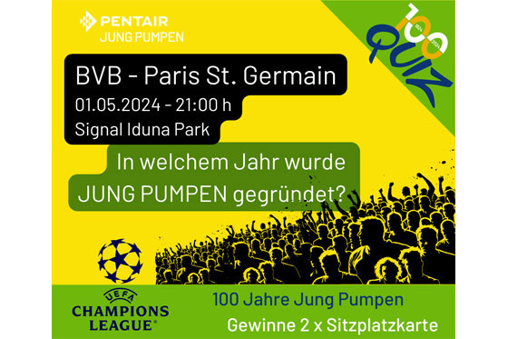 Jung Pumpen wird 100 und feiert mit diversen Kunden-Aktionen. Aktuell werden 2 Tickets für das Champions League Halbfinale am 1. Mai verlost.
