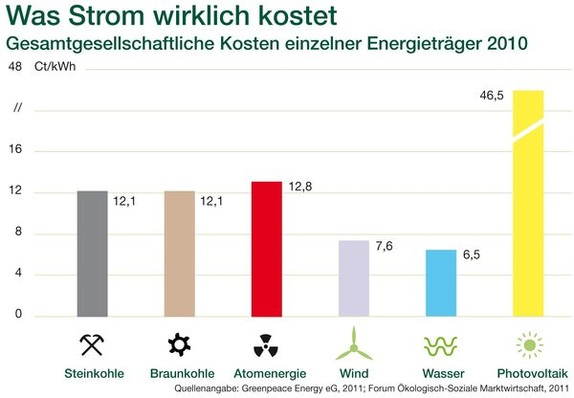 Strom aus Wind- und Wasserkraft ist unter Berücksichtigung aller Kosten schon heute deutlich billiger als Strom aus Kohle und Kernenergie. Strom aus Kernenergie kostet danach fast doppelt so viel wie Wasserkraft und zwei Drittel mehr als Windenergie.