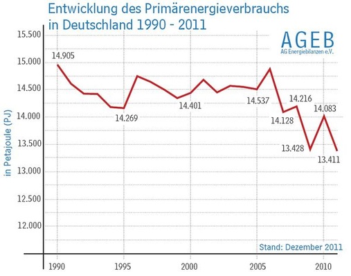 Von der milden Witterung stark beeinflusst, wird 2011 der Energieverbrauch in Deutschland auf etwa 13.411 PJ zurückgehen. Nach vorläufigen Berechnungen der AG Energiebilanzen beträgt der Rückgang bei verändertem Energiemix knapp 5 %.