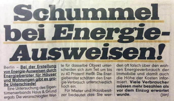 Der Energieausweis hat es am 19.10.2015 auf Seite 1 der Bild-Zeitung geschafft: „Schummel bei Energie-Ausweisen“. Von „Schummel“ handelt der kurze Bericht eigentlich nicht, klagt aber an, dass es bei der Erstellung von Energieausweisen durch Energieberater große Unterschiede gibt.