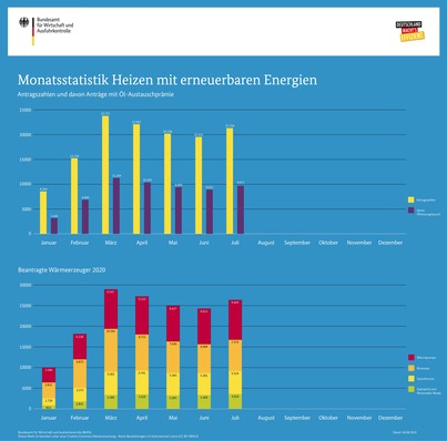 Das Anfang 2020 novellierte Marktanreizprogramm für das Heizen mit erneuerbaren Energien wird stark nachgefragt. Bis einschließlich Juli wurden 130 697 Anträge gestellt, davon 45,6 % mit Öl-Austauschprämie.