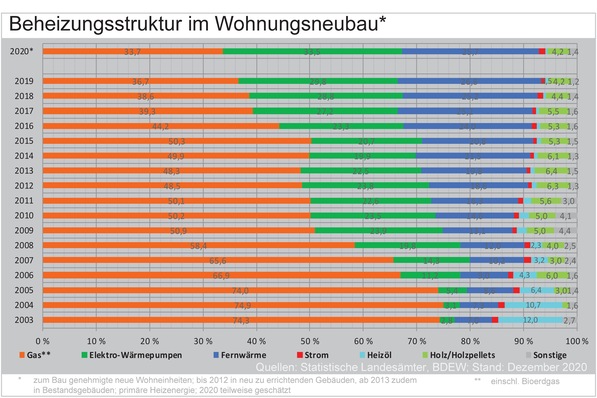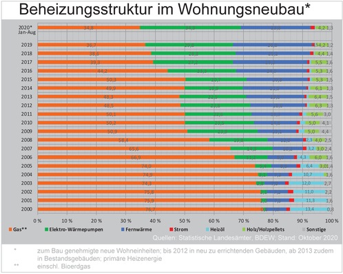 Der Anteil der Gas-Heizung als „primärer Energieträger / Heizsystem“ neu genehmigter Wohnungen erodiert immer schneller. Marktführer ist die Wärmepumpe.