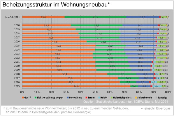 Lange war Erdgas dominanter Spitzenreiter bei den primären Energieträgern / Heizsystemen neu genehmigter Wohnungen. Nun hat die Wärmepumpe übernommen.