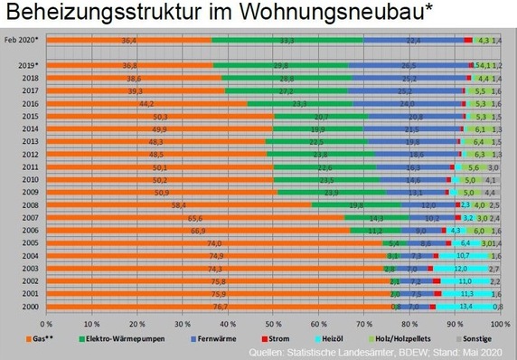 Nur 42,8 % der 2019 fertiggestellten Wohngebäude werden vorwiegend mit Öl und Gas beheizt. 2000 bekamen noch 93 % der Neubauten eine Öl- oder Gas-Heizung.
