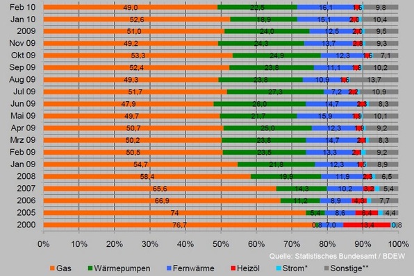 2009 hat die Elektro-Wärmepumpe im Neubau erneut deutlich Marktanteile gewonnen. Sie wurde bei 24 % (2008: 19,9 %) der Baugenehmigungen für neue Wohnungen als Heizsystem angegeben. Der den Markt noch dominierende Energieträger Erdgas hat erneut erheblich Marktanteile verloren. Sein Anteil sank 2009 auf 51 %, das war ein Verlust von 7,4 Prozentpunkten.
