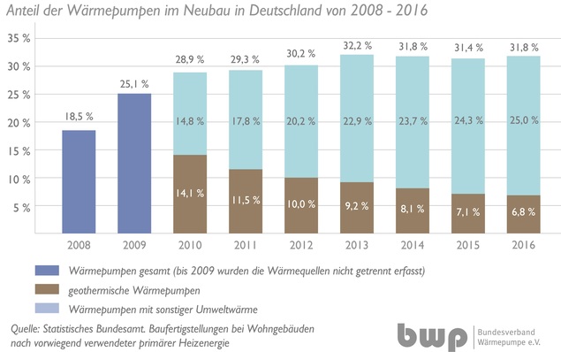 1 Der Anteil der Wärmepumpe im Neubau (Anzahl der Wohngebäude) blieb 2016 mit 31,8 % gegenüber 2015 weitgehend konstant. Dies belegen neueste Zahlen des Statistischen Bundesamtes. Besonders stark ist die Wärmepumpe im Bereich Ein- und Zweifamilienhäuser (34,0 %). Auch bei...