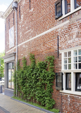 Fassadenbegrünung in Dokkum, Niederlande, auf nur einem halben Quadratmeter Grundfläche mit direktem Regenwasseranschluss vom Dach, ohne Energiebedarf für die Bewässerung, mit Versickerung des überschüssigen Regenwassers. Also eine dezentrale 100%ige Regenwasserbewirtschaftung, Verdunstung im...