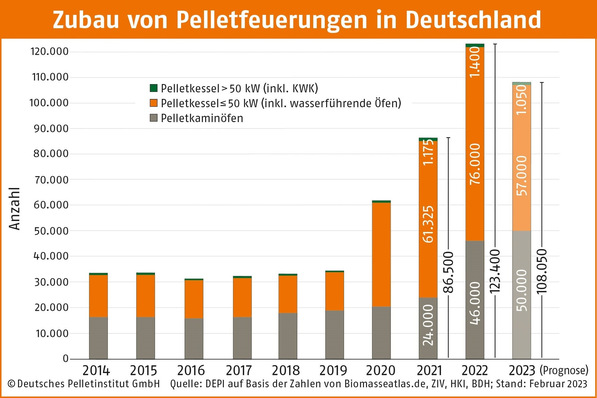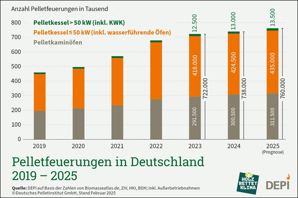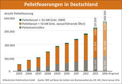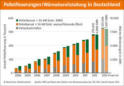 Der DEPV hat für 2013 einen Zubau von über 43.000 Pellet-Feuerungen gemeldet. Damit wuchs der Bestand auf knapp 322.000 Anlagen (Heizkessel und Öfen). Für 2014 prognostiziert der Verband die Installation von 47.000 neuen Pellet-Feuerungen.