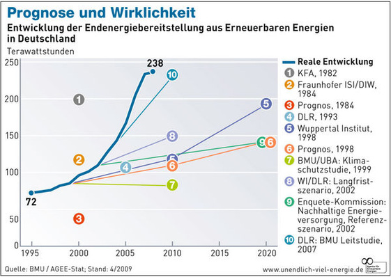 Prognosen haben die Entwicklung erneuerbarer Energien bisher meistens klar unterschätzt. Das belegt eine Studie, die 50 Szenarien und das Erreichte vergleicht.
