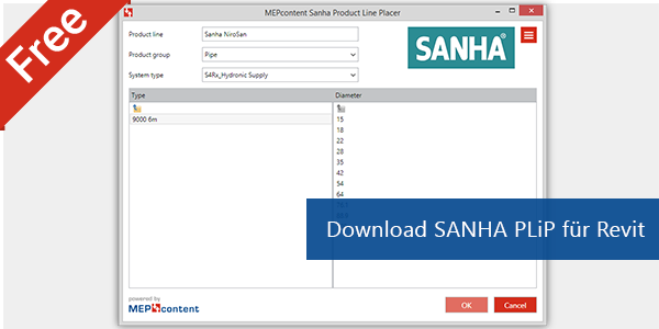 Zusammen mit MEPcontent entwickelte SANHA ein intelligentes Werkzeug zur Konstruktion von SANHA Rohrleitungssystemen in Revit. Sie können diese App kostenlos auf der MEPcontent-Website herunterladen.