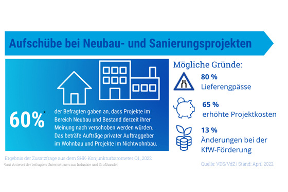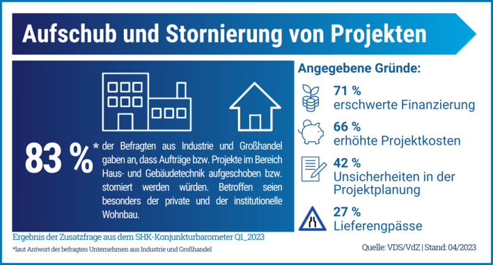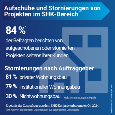 In der Erhebung des SHK-Konjunkturbarometers zum 1. Quartal 2024 berichten 84,3 % der Industrieunternehmen und Großhändler von verschobenen oder stornierten Projekten.