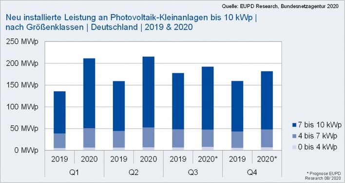 EUPD Research erwartet 2020 bei PV-Anlagen bis 10 kWhp einen Rekordzubau von 800 MWp. Sinkende Preise machen Eigenverbrauchslösungen attraktiver.