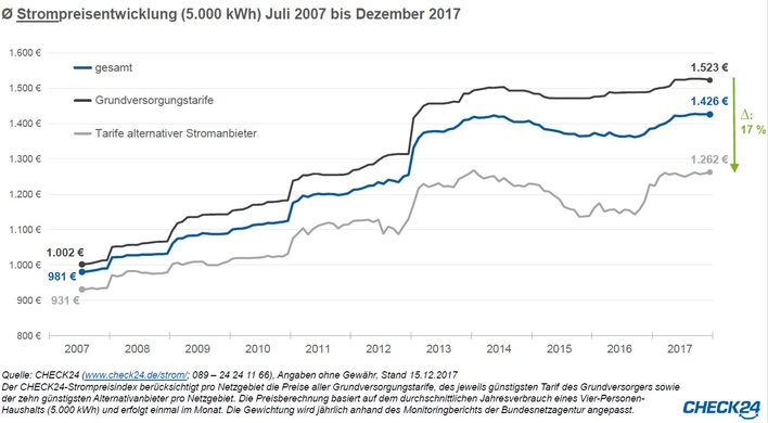 Der Strompreis ist seit Januar 2017 durchschnittlich um 3 % gestiegen, der Gaspreis im Mittel um 1 % gesunken. 140 Stromgrundversorger passen die Preise Anfang 2018 an, knapp die Hälfte senk ihren Preis, der Rest erhöht. Die Gasgrundversorgung wird bei 27 Anbietern teurer, bei 47 Anbietern günstiger, bei alternativen Anbietern ist Gas aber derzeit sehr günstig..