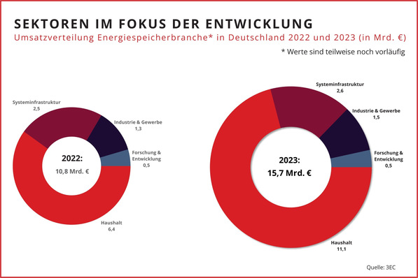Die Energiespeicherbranche ist 2023 mit + 46 % erneut dynamisch gewachsen. Schlechte Stimmung bremst aber den wichtigen Marktbereich Industrie & Gewerbe.