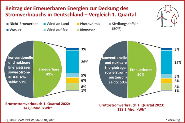 Rund 69 TWh Strom sind im 1. Quartal 2023 in Deutschland aus erneuerbaren Energien erzeugt worden. Das entspricht rund 50 % des Stromverbrauchs.