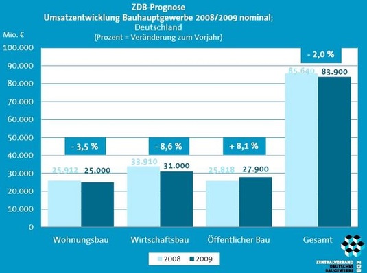 Wirtschafts- und Wohnungsbau werden 2009 um insgesamt 3,8 Mrd. Euro rückläufig sein. Zuwächse beim öffentlichen Bau wird dies nur teilweise kompensieren.