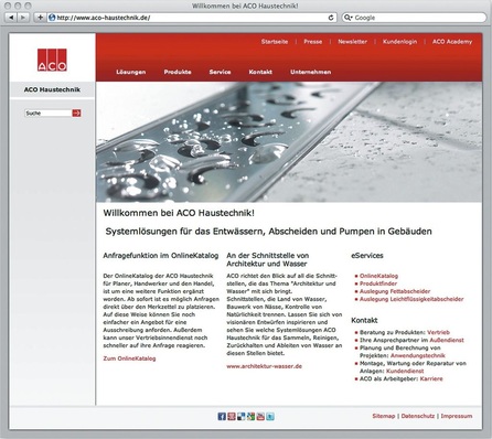 ACO Haustechnik hat seine Website einer „technischen und ästhetischen Rosskur“ inklusive inhaltlichen und strukturellen Änderungen, Erweiterungen und Verbesserungen unterzogen. Interessant ist die duale Wegführung hin zum gesuchten Produkt: Zum einen über das Menü Produkte, gegliedert in die...