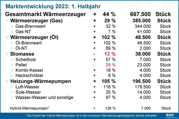 Im 1. Halbjahr 2023 ist der Absatz neuer Wärmeerzeuger um 44 % gestiegen. Die Dynamik lasse jedoch nach. Vom Heizungsgesetz wird kein Schub erwartet.