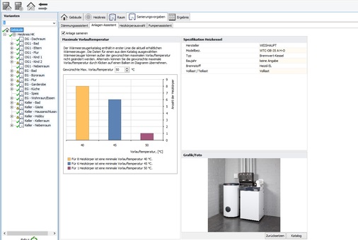 Darüber hinaus ist es möglich, mit Optimus über den Sanierungsassistenten Vorlauftemperaturen, energetische Verbesserungen am Gebäude oder der Anlagentechnik zu berechnen. Kundenorientierte Aussagen über den Einsatz von alternativen Wärmeerzeugern oder über andere energetische Schwachstellen können so problemlos getätigt werden.