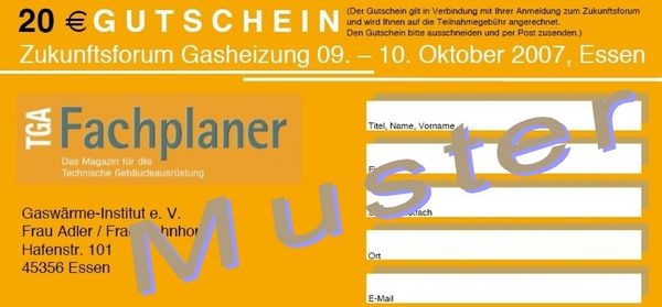 TGA-Leser erhalten mit ihrem Heft 09-2007 am 31. August durch eine Medienpartnerschaft einen Gutschein zur vergünstigten Teilnahme am Zukunftsforum Gasheizung am 9. und 10. Oktober in der Zeche Zollverein, Essen. Hier wird branchenübergreifend über „die Innovationsoffensive der Gaswirtschaft“, „Status, Verfügbarkeit und Markteinführung neuer Technologien“, „Auswirkungen der Klimaagenda 2020“ und „Biogaseinspeisung und -anwendung in der Heiztechnik“ diskutiert.