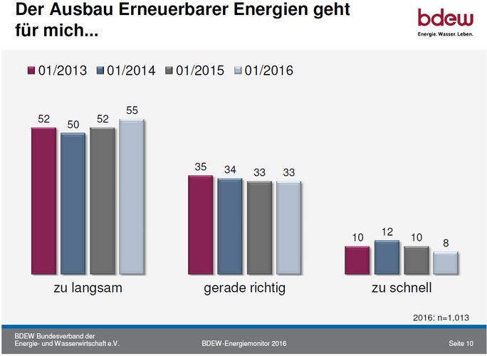 Obwohl gleichzeitig 69 % der Befragten mit steigenden Strompreisen durch die Energiewende rechnen, geht einer deutlichen Mehrheit von 55 % der Ausbau der Nutzung erneuerbaren Energien nicht schnell genug, nur 8 % der Befragten erfolgt er zu schnell. 67 % (60 %) der Befragten sehen in der Energiewende Vorteile für den Wirtschaftsstandort Deutschland.