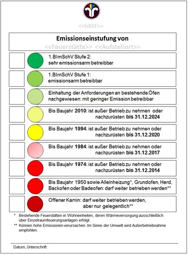 Die Ampel soll als verbraucherfreundliche Hilfe zur bereits durch den Schornsteinfeger erfolgten Emissionseinstufung wirken. Zielsetzung ist, so der HKI-Geschäftsführer Frank Kienle, dass die Schornsteinfeger im Rahmen ihrer Feuerstättenschau noch einmal auf die Emissionseinstufung von Einzelraumfeuerstätten hinweisen und die Verbraucher verstärkt in Richtung neue, emissionsarme Geräte beraten. Bisher haben neue, emissionsarme Einzelraumfeuerungsanlagen in Deutschland nur einen Anteil von weniger als 25 % am gesamten Gerätebestand. ■
