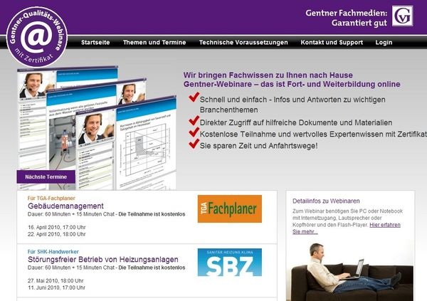 ...der Gentner Verlag bietet die Webinare zur bequemen Online-Fortbildung zusammen mit den Industriepartnern Honeywell und Grundfos an. Gestartet ist das Angebot mit einem Webinar zur KfW-Sonderförderung 431. Über 1000 Teilnehmer informierten sich auf den ersten sechs Veranstaltungen und haben die Möglichkeit, Fragen per Chat zu stellen, rege wahrgenommen. ToR
