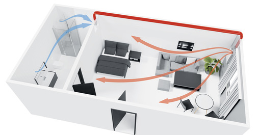 Das dezentrale Lüftungsgerät gewährleistet eine optimale, bedarfsgeführte Steuerung. Der serienmäßige Feuchtesensor misst permanent die relative Feuchte im Raum und sorgt ganz automatisch für den notwendigen Luftaustausch. Ein optionaler CO2-Sensor verbessert darüber hinaus die Qualität der Innenraumluft, indem er bei zunehmender CO2-Kon-zentration die Luftleistung erhöht.