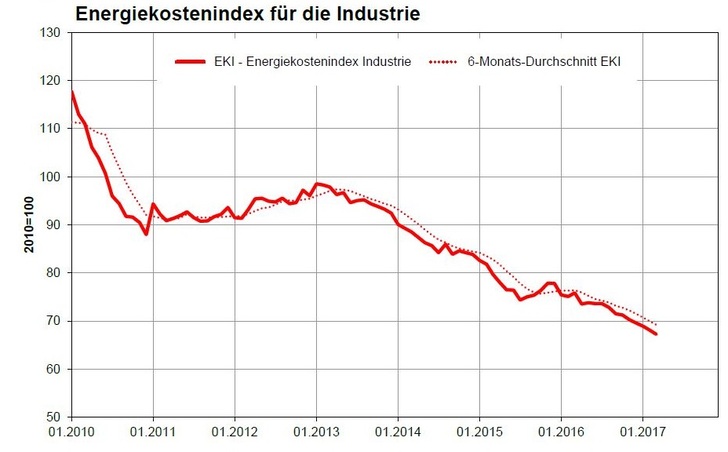 Die sinkenden Energiestückkosten ergeben sich zunächst aus der seit März 2016 insgesamt um 8,8 % gesunkenen Energiekosten. Diese liegen weiterhin auf sehr niedrigem Niveau – seit Anfang 2017 erstmals unter 2,5 Mrd. Euro monatlich. Für die absolute Energierechnung heißt das: die Kosten für die Öl- und Gasbeschaffung reduzierten sich um 17,7 %, die für Elektrizität um 6,1 %. Die Kosten für die Kohlebeschaffung hingegen stiegen um 33,7 %. Gleichzeitig stieg die industrielle Produktion von März 2016 bis März 2017 um insgesamt fast 3 % an.